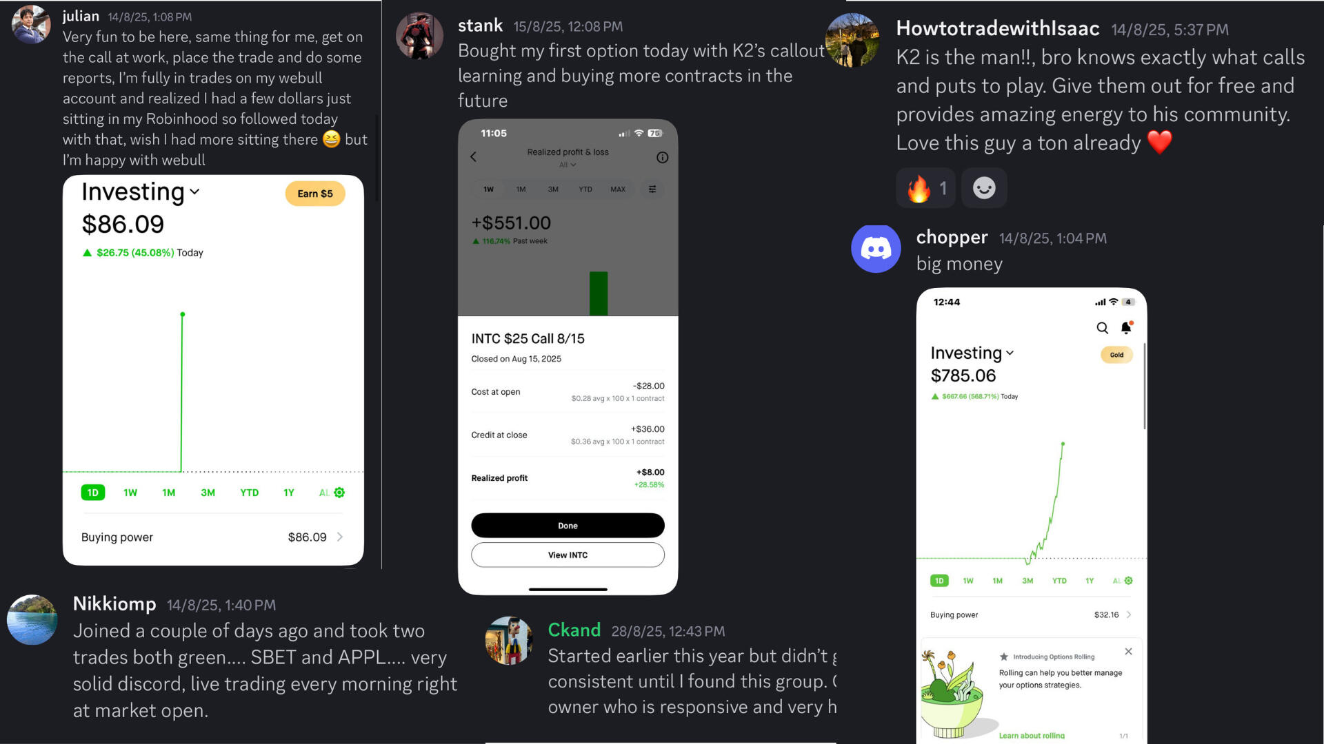 Real-Time Entries and Exits (No Delay): Trade Live with Me, Maximize your options trading with Daily Livestreams with ZERO delay.Trade thesis and Recaps: Almost every trade we take, I post an exclusive recap showing why I got into that trade. This helps teach you more in-depth into my strategy so you can eventually start taking trades on your own.Get access to Swing Trades + Long-Term Trades: I’ll alert you on my entries and exits for my swing trades (holding 1-30 days). Swing Trades are where the real money is made. Plus, you get access to my Full Long-term portfolio with alerts of any changes.Members only Education: Completely custom-made course I made specifically for members, this, along with the daily live trading, almost guarantees you will learn everything about my strategy and how to grow your portfolio.Access to K2 + A Community of Profitable Traders (FEEDBACK): Practice won’t make you improve unless you get FEEDBACK. Get help from not only me, but a whole community of supportive, learning K2 traders.