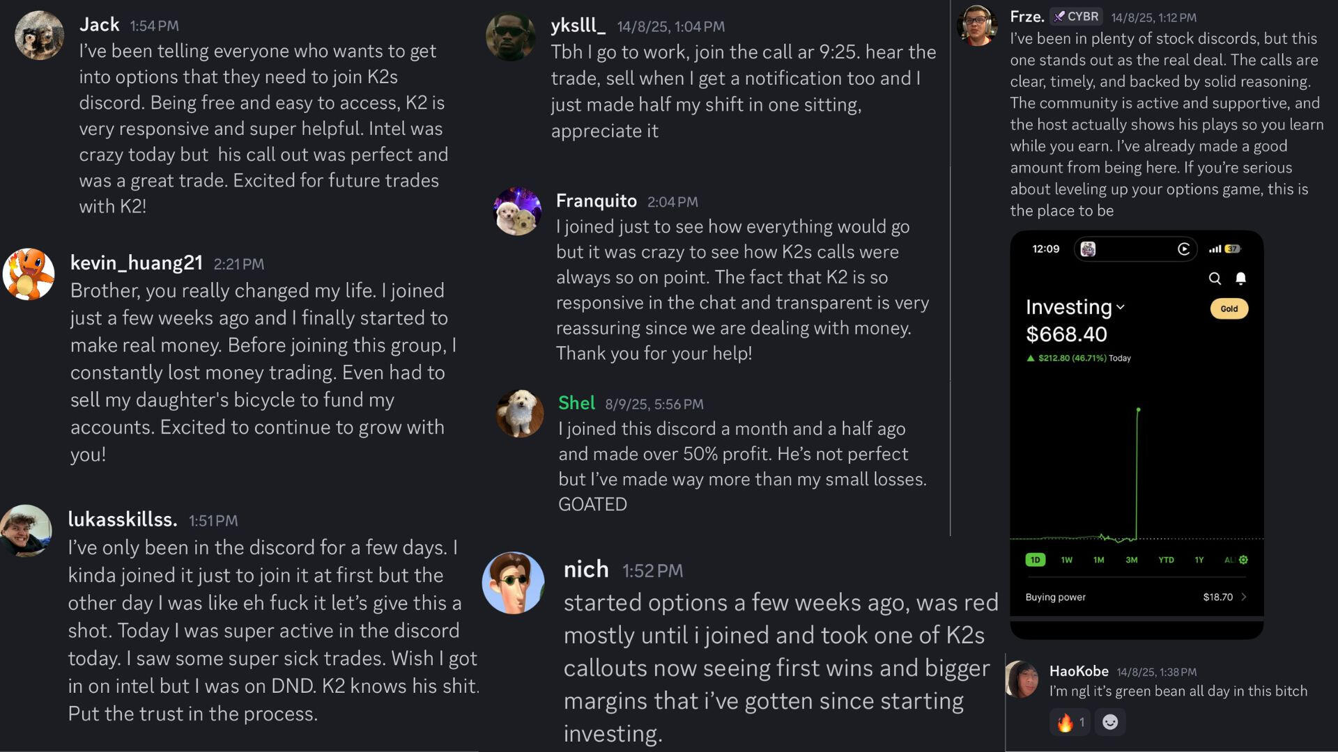 πΊ I Real-Time Entries and Exits (No Delay): Trade Live with Me, Maximize your options trading with Daily Livestreams with ZERO delay.π I Trade thesis and Recaps: Almost every trade we take, I post an exclusive recap showing why I got into that trade. This helps teach you more in-depth into my strategy so you can eventually start taking trades on your own.β I Get access to Swing Trades + Long-Term Trades: Iβll alert you on my entries and exits for my swing trades (holding 1-30 days). Swing Trades are where the real money is made. Plus, you get access to my Full Long-term portfolio with alerts of any changes.π I Members only Education: Completely custom-made course I made specifically for members, this, along with the daily live trading, almost guarantees you will learn everything about my strategy and how to grow your portfolio.π§π€π§ I Access to K2 + A Community of Profitable Traders (FEEDBACK): Practice wonβt make you improve unless you get FEEDBACK. Get help from not only me, but a whole community of supportive, learning K2 traders.