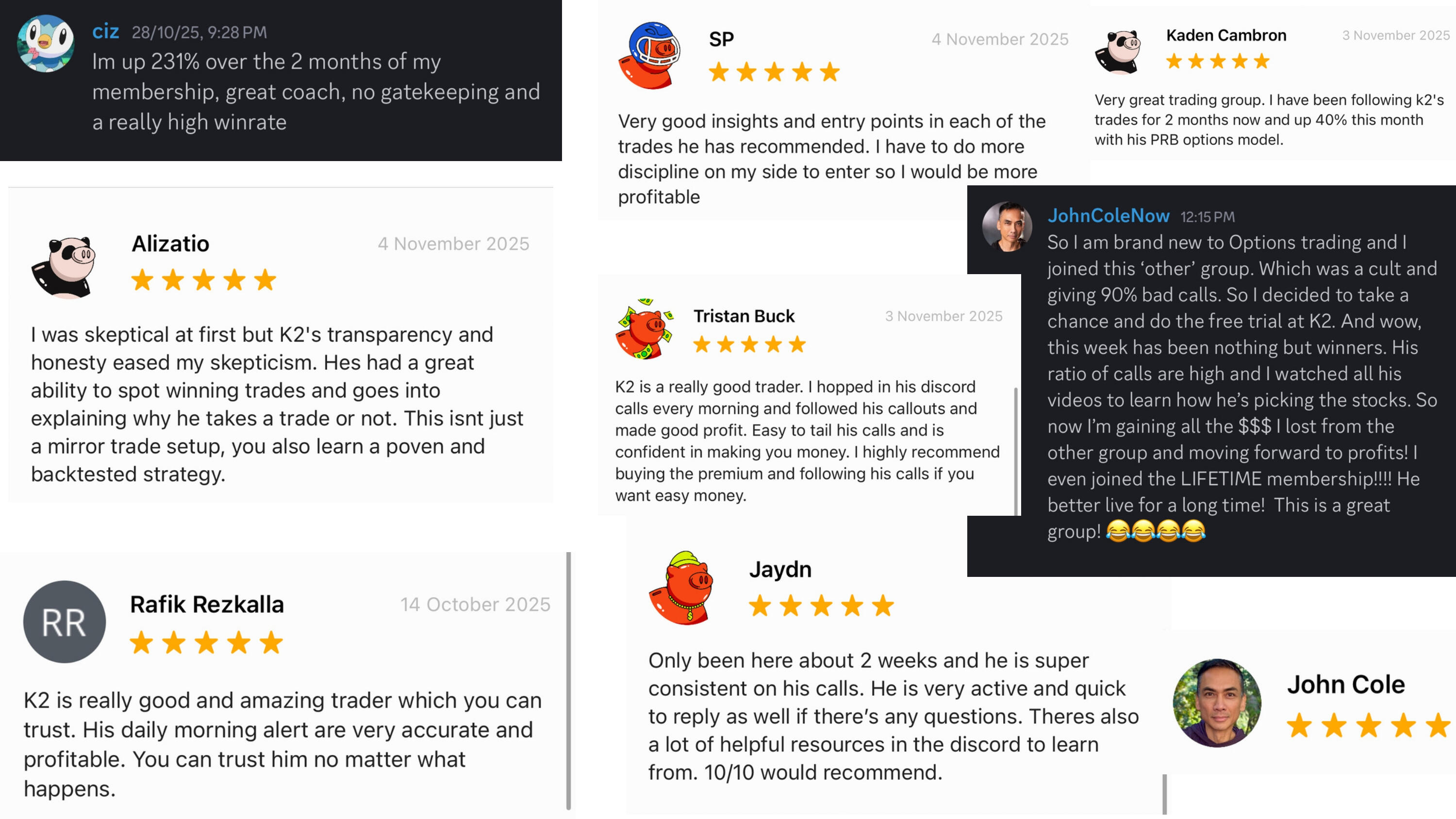 Real-Time Entries and Exits (No Delay): Trade Live with Me, Maximize your options trading with Daily Livestreams with ZERO delay.Trade thesis and Recaps: Almost every trade we take, I post an exclusive recap showing why I got into that trade. This helps teach you more in-depth into my strategy so you can eventually start taking trades on your own.Get access to Swing Trades + Long-Term Trades: I’ll alert you on my entries and exits for my swing trades (holding 1-30 days). Swing Trades are where the real money is made. Plus, you get access to my Full Long-term portfolio with alerts of any changes.Members only Education: Completely custom-made course I made specifically for members, this, along with the daily live trading, almost guarantees you will learn everything about my strategy and how to grow your portfolio.Access to K2 + A Community of Profitable Traders (FEEDBACK): Practice won’t make you improve unless you get FEEDBACK. Get help from not only me, but a whole community of supportive, learning K2 traders.